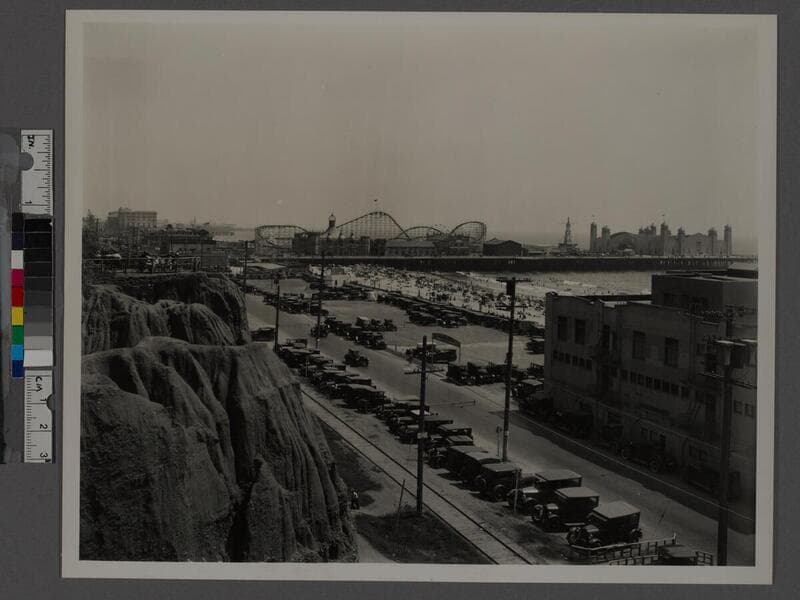Image of people walking along the Santa Monica Municipal Pier at right and the Santa Monica Amusement Pier at left in Santa Monica, California. Visible on the pier are the Whirlwind Dipper roller coaster, Looff Hippodrome, and the La Monica Ballroom. With visible signs including "Whirlwind Dipper," "The Overlook Hotel & Apts., "La Monica Ballroom Auto Park," and "La Monica School of Dancing."