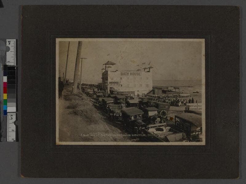 View looking north on the coast road along Santa Monica beach (present day Pacific Coast Highway). The Palisades Park bluff is on the right, and automobiles are parked next to railroad tracks along the road. The Santa Monica Bath House is the large white building on the beach that says "Bath House" on the outside wall.