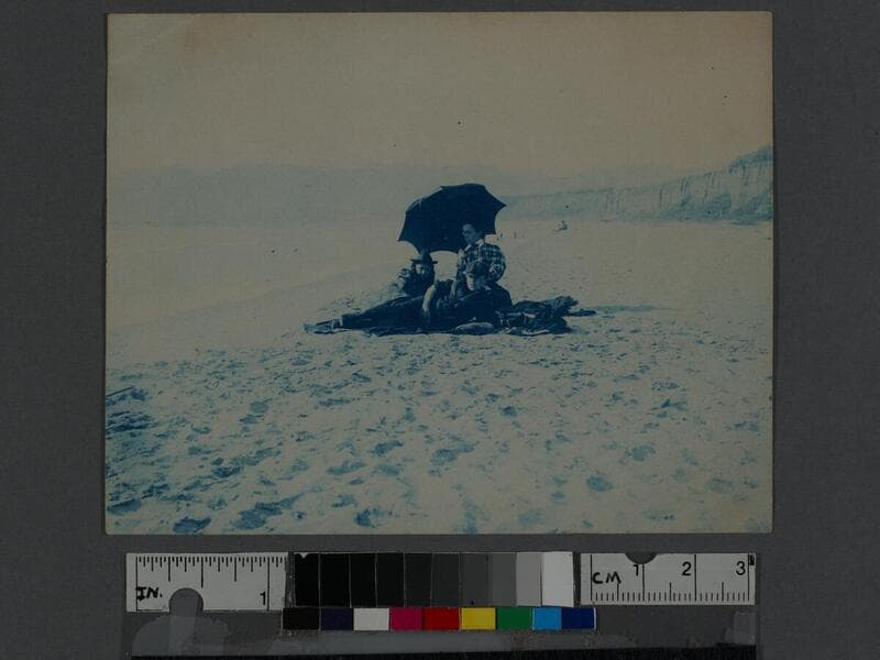 Image of women from the Halsted family sitting under a tree at the family home on Orienta Ranch in Alhambra, California, with a man lying in the shade reading a book, dogs, and a boy pointing a rifle.