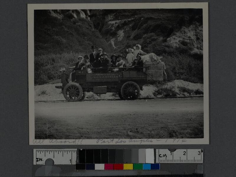 A photograph of an open book, showing an image of people standing in front of Pacific Electric streetcar no. 235 on the Long Wharf in Santa Monica. Railway employees stand in front of the streetcar.