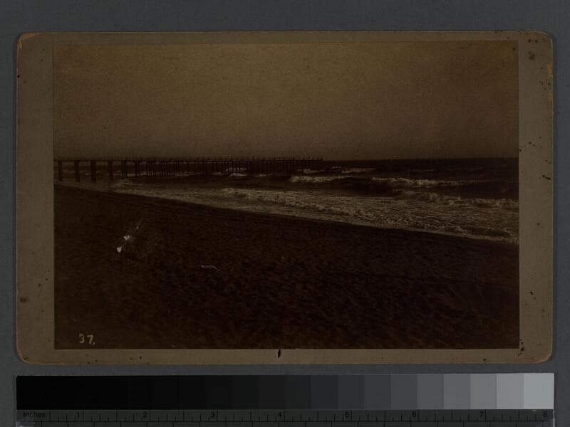 Image of a beach with people swimming in the water at Ocean Park south of Santa Monica, California, with a short pier and long building that appears to be the Cafe Nat Goodwin on the Crystal Pier (previously the Bristol Pier) visible. The longer Santa Monica Municipal concrete pier can be seen in the distance.