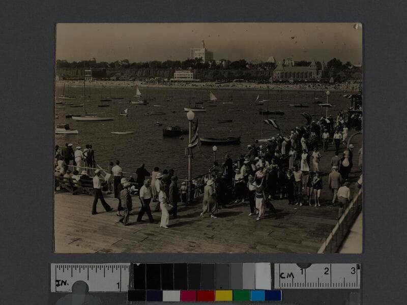 Image of a view of the Santa Monica Yacht Harbor looking back to Santa Monica beach in Santa Monica, California, with the California Incline seen at left, the two-story Wavecrest Club at center and the edge of the Santa Monica Athletic Club at right.