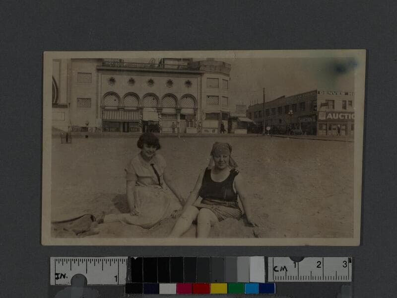Image of three women in bathing caps and swimsuits standing on the beach in front of the Ocean Park Bath House at Ocean Park in Santa Monica, California. The bathing suits have the initials "O.P." and a sign for "The American Co [obscured] Buy Bishops milk" is seen at right.