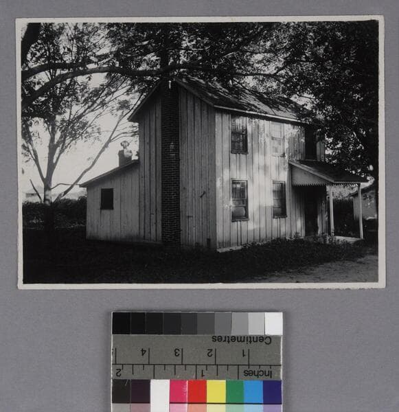 The house ("Haunted House") in which Edwin Powell Hubble and Grace Burke Hubble lived while he worked at the Ballistics Research Lab, 1942-1945. Note in the hand of Edwin Powell Hubble: "Haunted House, Spesutie Island, Aberdeen, Md., 1945." The wooden house stands adjacent to a dirt road, and a brick chimney is visible on the side of the house. A large tree is visible in the foreground.