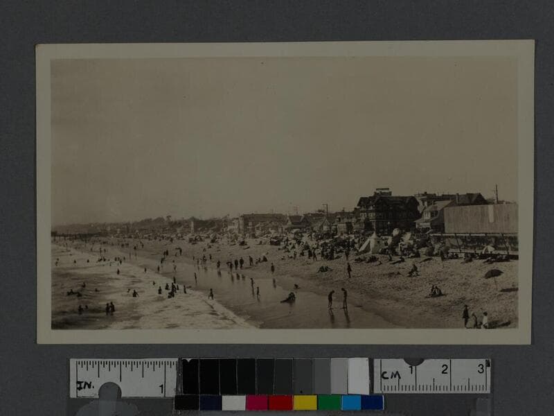 Image of people on the beach at Ocean Park in Santa Monica, California, in 1906, with beach houses and a boardwalk at left.