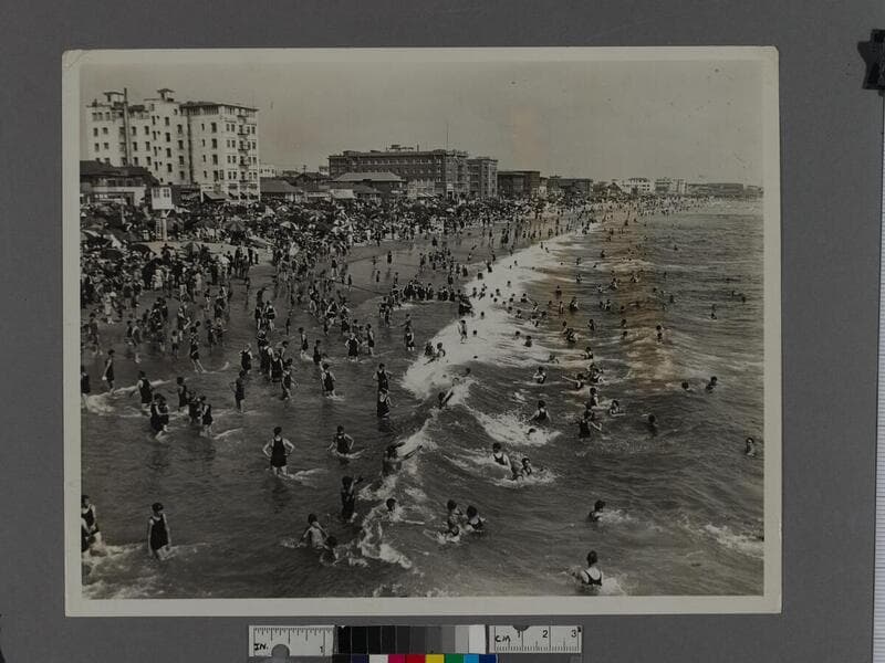 Image of a crowd of people in the water and on the beach at the Bathing Strand at Ocean Park in Santa Monica. California, with multiple buildings along the beach, including a part of the Ocean Park Bath House visible at far left, and a portion of the Abbot Kinney Venice Pier visible in the distance at right. The Ocean View hotel and apartments with signs that read "Morley's" and an advertisement for Maier beer and the Cadillac Hotel are visible at left, as well as signs for a pharmacy and New Denver Hotel.