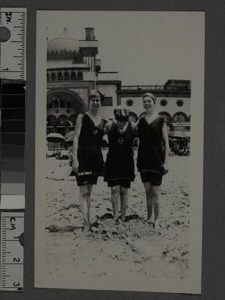 Image of three women wearing bathing suits and holding a rope in a souvenir studio portrait while posing in front of a painted beach backdrop at Ocean Park in Santa Monica, California.