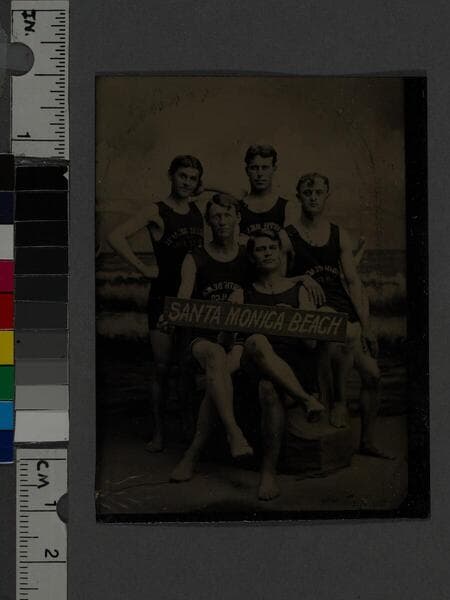 Image of a souvenir studio portrait of three men standing in front of a painted beach backdrop in Santa Monica, California, including an old man and two men with mustaches.