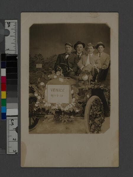 Image of a studio portrait of three women in hats with flowers and a man sitting in an automobile in front of a painted backdrop with a sign reading "Venice 4 miles," at Venice in Los Angeles, California.