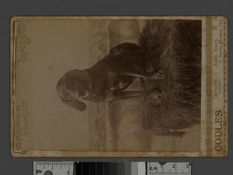 Image of a man and woman holding a baby on top of a stuffed mule while posing in front of a painted beach backdrop for a studio portrait at Ocean Park in Santa Monica, California, 1907.