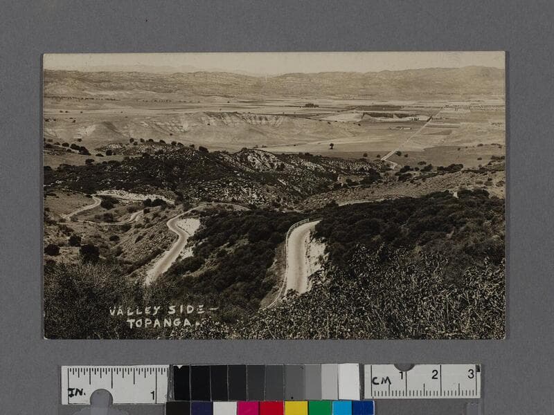 View of the West San Fernando Valley, looking north from the summit of Topanga Canyon Highway. The canyon road leads to the San Fernando Valley, showing a few buildings and an open landscape. This location is present-day Woodland Hills and vicinity.