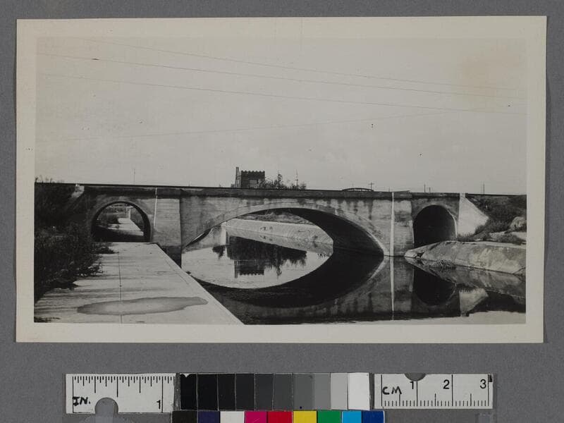 Bull Run, Virginia, looking upstream. Railroad bridge in distance. Photograph showing a man fishing in the Occoquan River with the Bull Run Bridge in the background. Several men can be seen on the bridge.