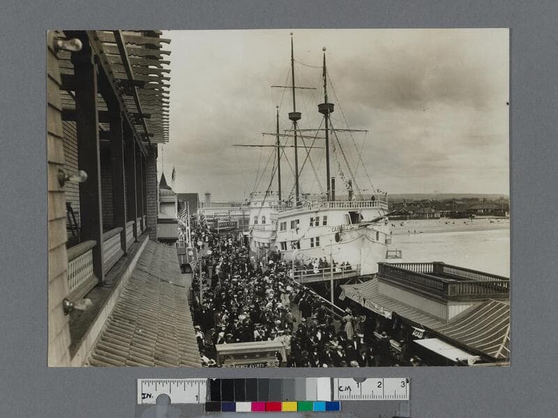 Aerial view of the Abbot Kinney Pier at Venice in Los Angeles, California. The Ship Cafe is seen at center between the Auditorium at right and the dance hall at left. A portion of the Big Dipper roller coaster is at upper left of image.