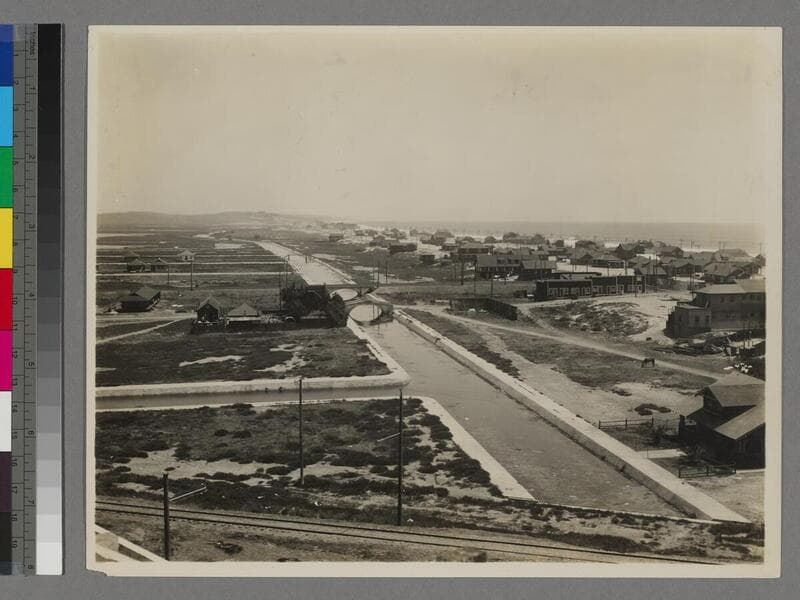 View of Venice, California from the top of the Race Thru the Clouds roller coaster, showing open land, homes and canal.