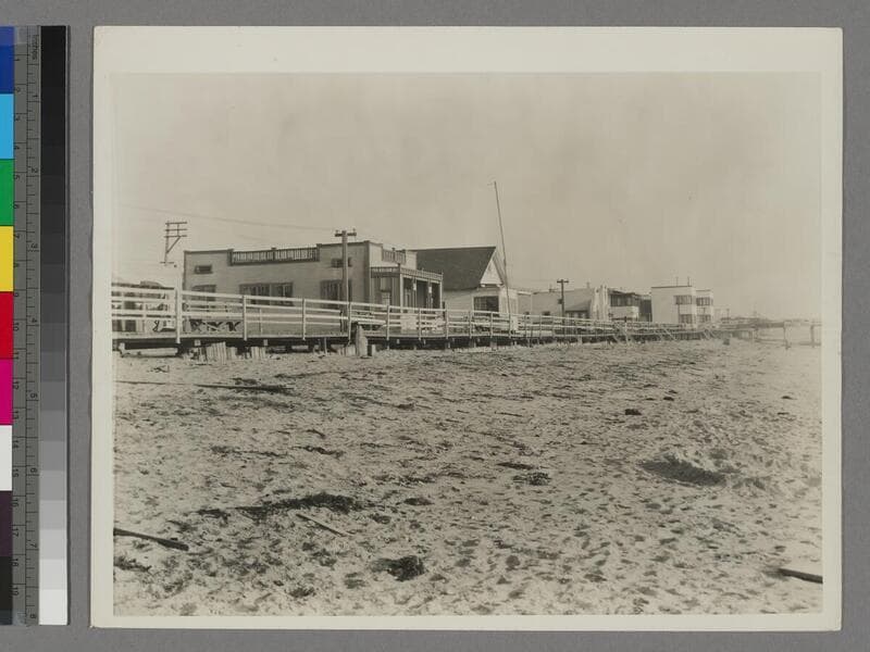 View of the Montezuma Apartments, a brick building at 401 Ocean Front Walk in Venice, California. Number "401" is on building above steps. The Cadillac Hotel (built 1914) is next door, with a sign for "Cadillac Cafe" on the lower level. The sand of the beach is in foreground, and a house on right.