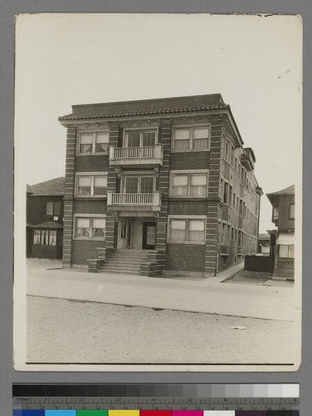 Automobiles parked on the street in front of the Brookside Apartments building at 20 Brooks Avenue, Venice, California. Lettering on side of building reads "Brookside Apts. Steam Heat."