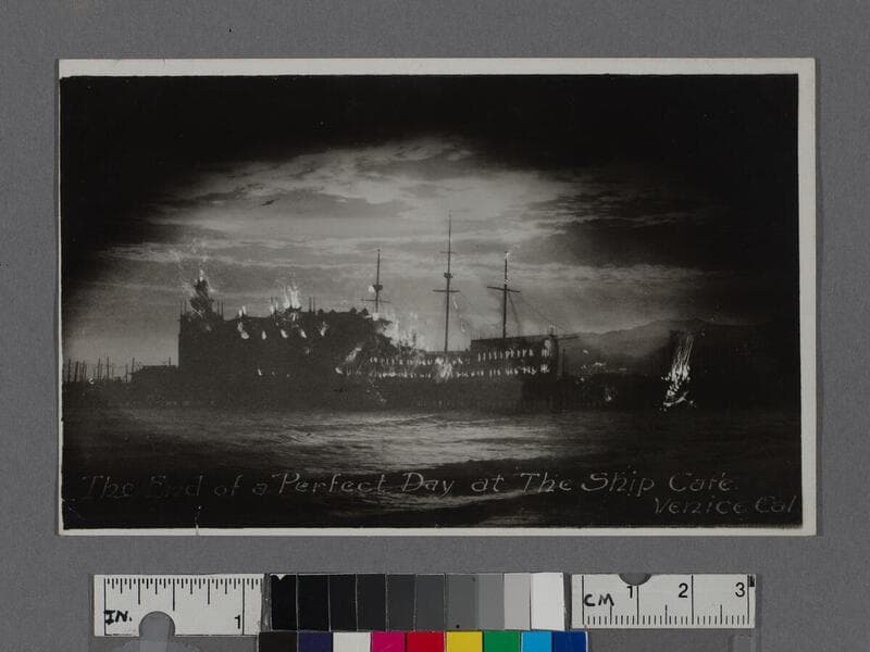Image of the Dance Pavilion on the Abbot Kinney Pier, enhanced with paint to simulate fire. The Abbot Kinney Pier in Venice, California, burned in a fire on December 20, 1920.