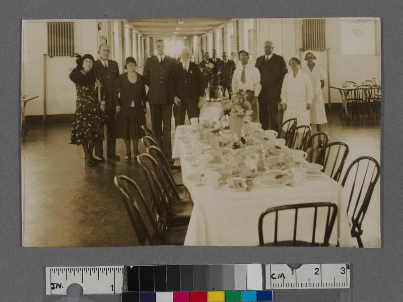 Image of people in front of the dining hall at the Soldiers' Home, a care home for veterans opened in 1888.