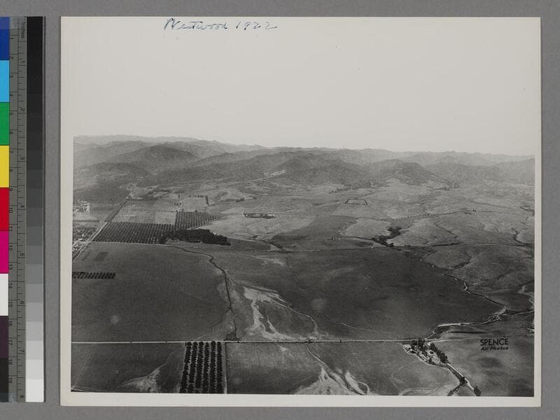 View of Westwood Village, showing agricultural crops in the foreground, and people standing at right. The buildings of the University of California, Los Angeles (UCLA) are seen on the hill in the distance at left. Forms panorma with: photCL_555_06_2658.