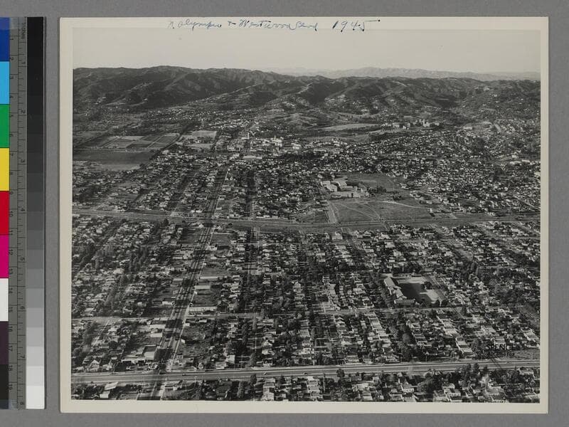 Aerial view of Westwood, in West Los Angeles, showing groves of trees and other agricultural crops, and roads running through hills. A few houses and buildings can be seen.