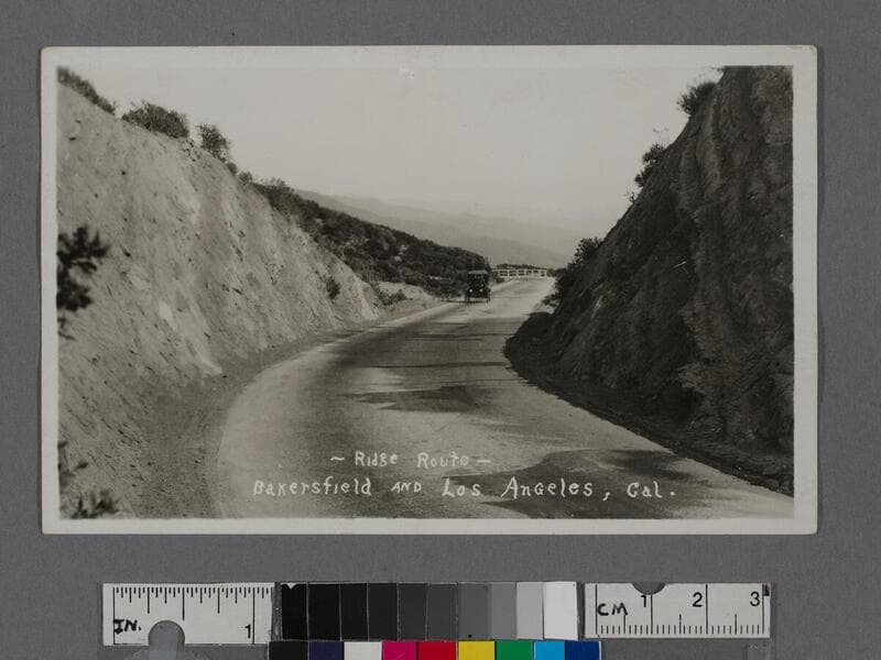 Image of the "Ridge Route" of Highway 99 surrounded by rocky mountains, presumably in Los Angeles County, California, with some automobiles visible.