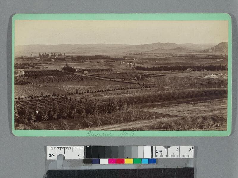 Landscape view of Riverside, showing agricultural crops and groves and a few houses.