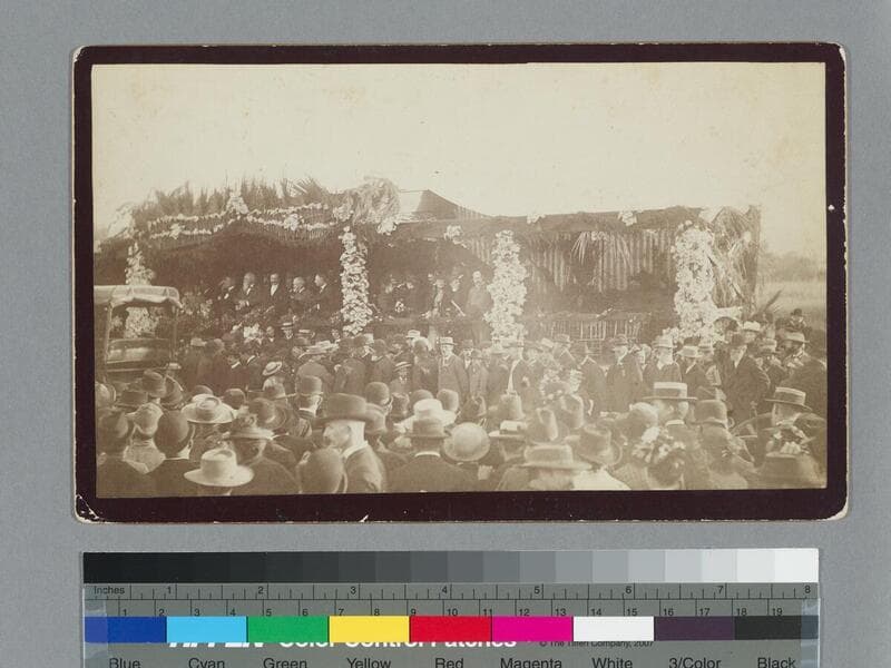 Image of United States President William McKinley (sitting at left next to an unidentified man) in a horse-drawn buggy decorated in roses and driven by two men in sombreros and entering Santa Barbara, California, with a crowd of spectators and a palm grove in the background.