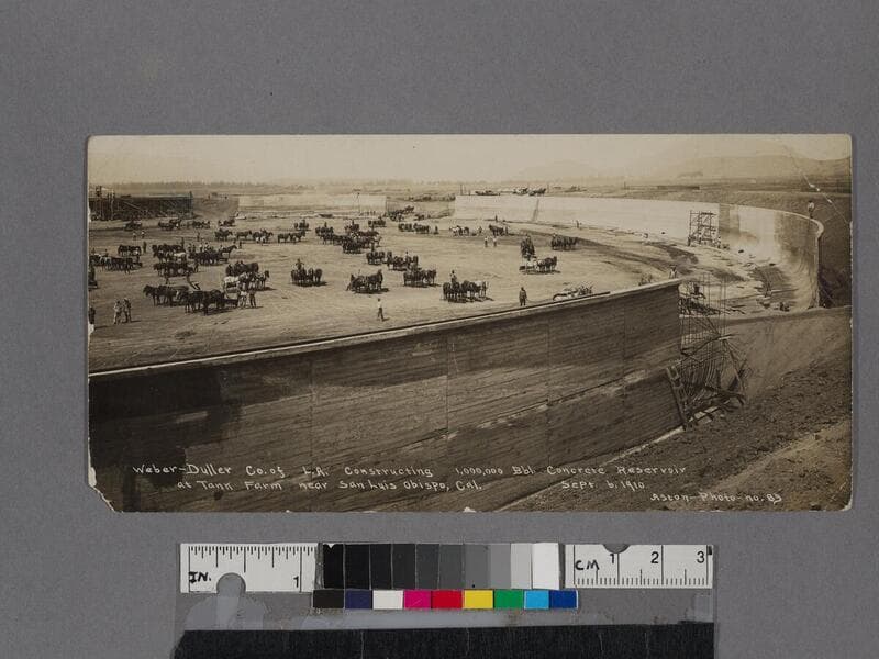 View of the construction of a 1,0000,0000-barrel concrete oil reservoir, which was built by the Weber-Duller Company for the Union Oil Company near San Luis Obispo, California, with construction workers and machinery visible.