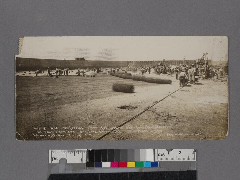 View of the construction of a 1,0000,0000-barrel concrete oil reservoir, which was built by the Weber-Duller Company for the Union Oil Company near San Luis Obispo, California, with construction workers working on a wooden frame.