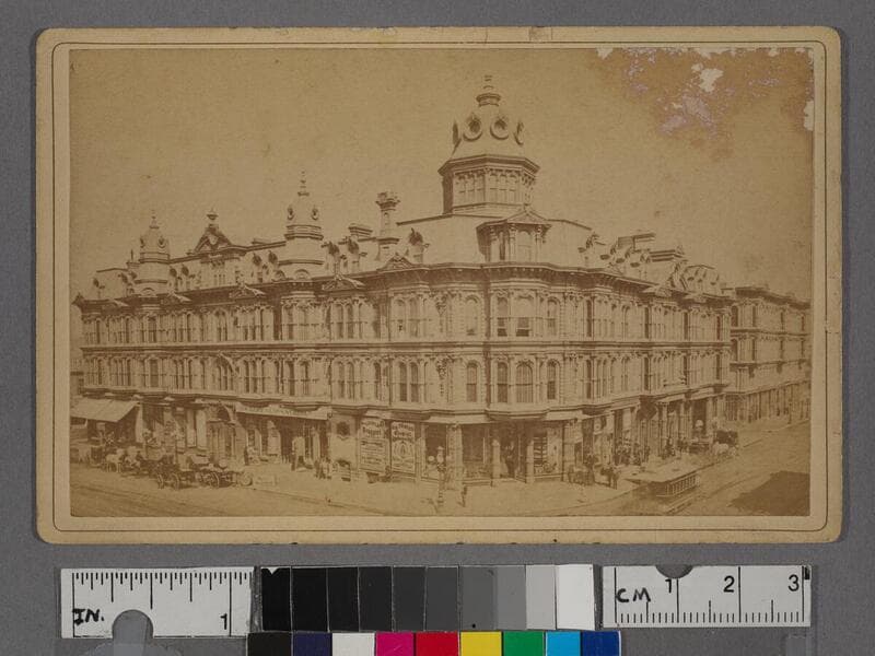 Image of an eye-level view of the dry goods establishment on a city block corner showing a busy Philadelphia, Pennsylvania, street scene with horse-drawn trolleys and carriages; men, women, and children in current fashions visible in foreground and along the city block.