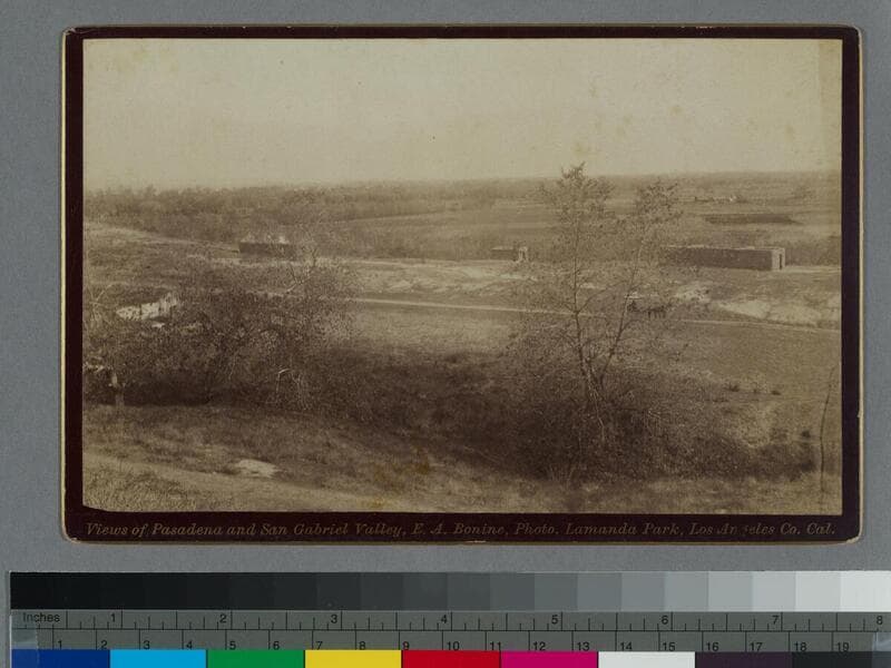 View of the rear of Mission San Gabriel Arcangel in San Gabriel, California, with trees, a field, and stone ruins in the foreground.