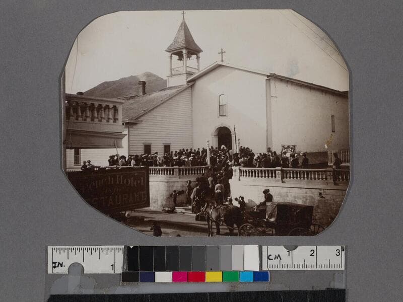 People gathered in front of Mission San Luis Obispo de Tolosa