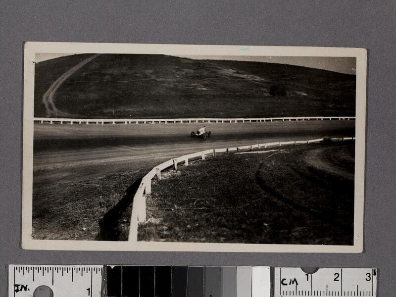 Race car driver Barney Oldfield on track at Legion Ascot Speedway, Los Angeles