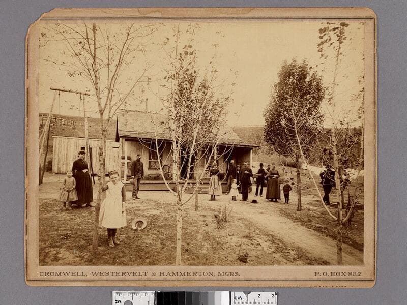Image of men, women and children with horses and cows on a farm in Los Angeles, California, with crops on the hillside in the distance.