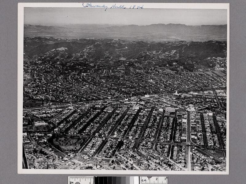 Aerial view of the residence of actress Myrna Loy in Hidden Valley near Beverly Hills, California, showing the surrounding hills and a tennis court.