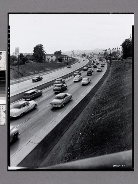 Image of automobiles driving on Cahuenga Pass in Hollywood, California, on United States 101 Highway, with railroad tracks for the Pacific Electric line along the center of the highway.