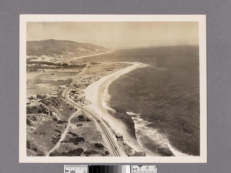 Image of an aerial view of the coastline, Roosevelt Highway (later Pacific Coast Highway) and Motion Picture Colony in Malibu, California.