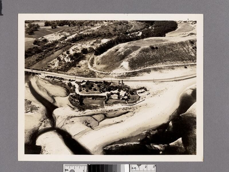 Image of an aerial view of the coastline, Roosevelt Highway (later Pacific Coast Highway) and Motion Picture Colony in Malibu, California.