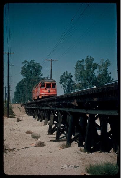 Pacific Electric Railway streetcar no. 5167 going over trestle on the Van Nuys line, in North Hollywood before the turnoff to Van Nuys, in the San Fernando Valley. The sign on the front of the car says "Los Angeles." The car has passed the Rio Vista station, in the distance (unable to see in this image).