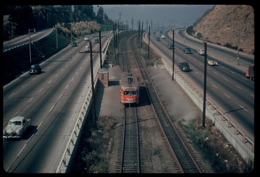 Pacific Electric Railway streetcar no. 5130 at Hollycrest station in the median of Highway 101 (Hollywood Freeway) in Cahuenga Pass, on the Van Nuys line. The sign on the front of the car says "Los Angeles."