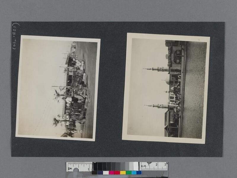 Top image shows the Venice Bathing Pavilion (or Venice Plunge) on Ocean Front Walk in Venice, California. Lower image shows swimmers in the Venice lagoon, with a three-story building in the background with writing across top: "Martin & Rockwell Block."