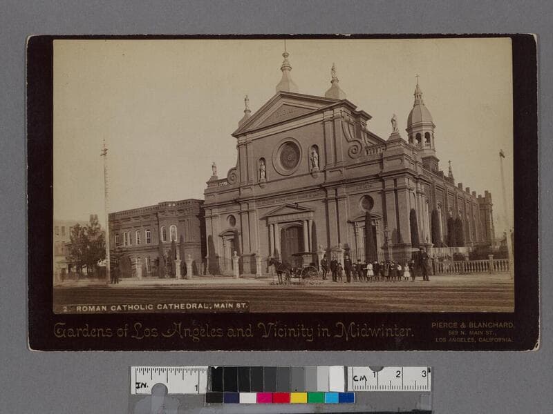 View of the California Incline road with automobiles, leading down from bluffs and Palisades Park, above the beach in Santa Monica, California. The Pacific Coast Highway, beach houses, the Santa Monica Pier with the La Monica Ballroom at its center, and other buildings are also in this view, with Ocean Park amusement piers are in the distance.