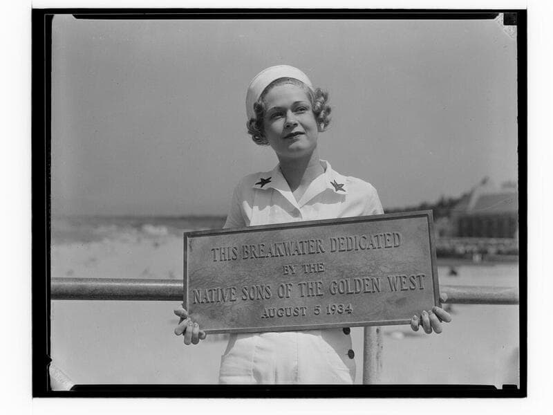 Woman holding dedication plaque for the Yacht Harbor Breakwater dedication, Santa Monica