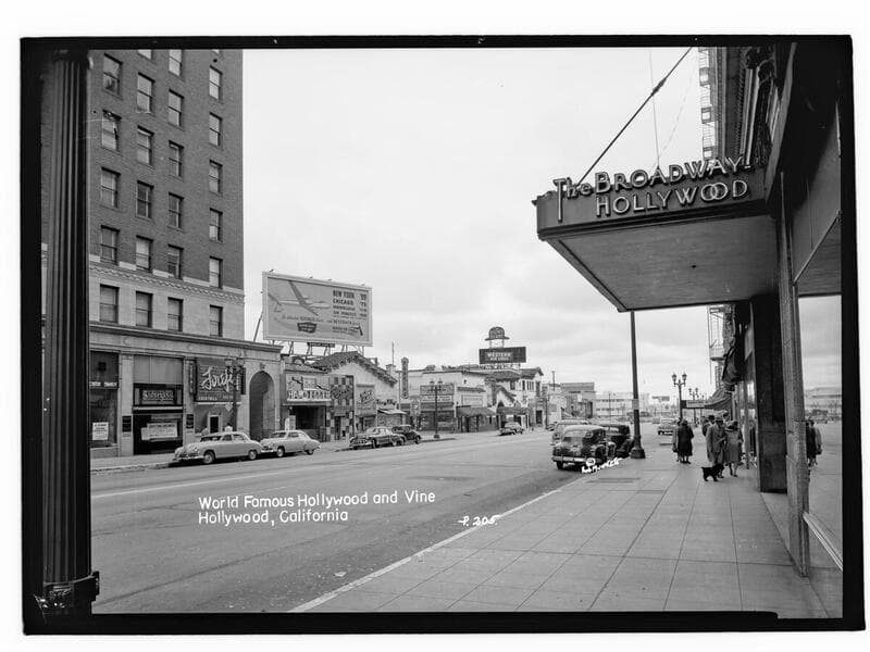 Image looking towards the intersection with Hollywood Boulevard from Vine Street in Hollywood, California. With visible signs for the Broadway Hollywood building, the Taft Building, Owl Rexall Drugs, the Equitable Building, Bernard Luggage Co., Schwab's Pharmacy, Du-par's Restaurant, and the Hollywood sign (in the distance).
