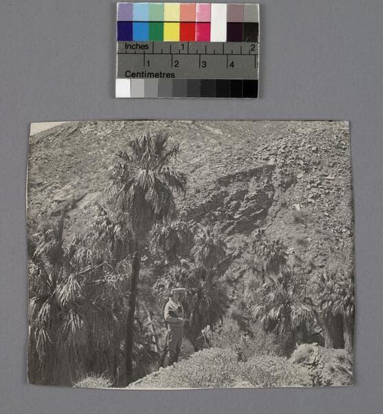 Grace Burke Hubble in Palm Canyon. Note in the hand of Edwin Powell Hubble: "Grace, Palm Canyon Calif." Grace Hubble is standing amongst desert scrub, with plam trees behind her.