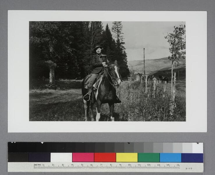 Grace Burke Hubble on horse "Streaky" at the Rio Blanco Ranch. Note in the hand of Edwin Powell Hubble on verso: "Grace on "Streaky" Rio Blanco Ranch, Colorado, 1939." The Rio Blanco Ranch is located in Meeker, Colorado. Mature pine trees are visible behind Grace Hubble, and hills are visible in the distance behind her, to her left. A crude wooden fence is to her left.