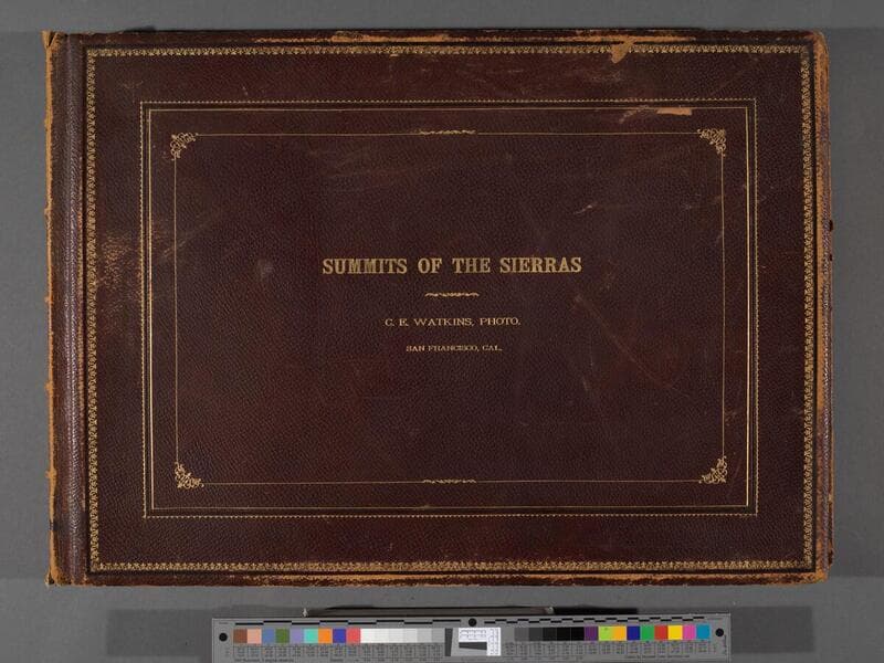 In 1879, Watkins was commissioned to travel to the peaks of California's Sierra Nevada mountains to photograph the U.S. Coast and Geodetic Survey led by George Davidson (1825-1911). The photographs in this album were made during that commission, in the summer of 1879. The album opens with a scene of people positioned in front of a hotel on the shore of Lake Independence, followed by views across the lake looking up toward Mount Lola. Watkins then ascended to the survey base at the top of Mount Lola (9,148 ft.), where he made several photographs of the vistas and details of the rocky terrain, including trees, rivers, canyons, and lakes. He also climbed to the summit of Round Top (10,381 ft.), and made several photographs from that viewpoint, including one carefully orchestrated view of Davidson and his team posed with their instruments and an observation hut on the craggy summit. Occasional figures appear on ridgelines in the photographs, and tents and wooden huts erected by the survey team are seen in some views.