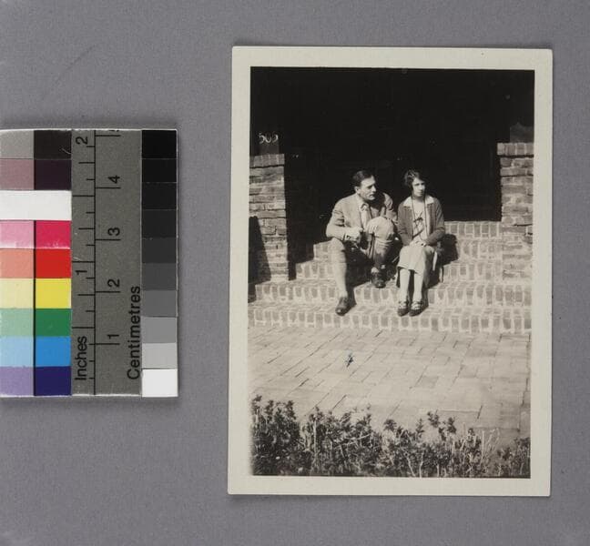 Edwin Powell Hubble and Grace Burke Hubble on their wedding day, February 26, 1924, seated on brick steps at the Burke family home