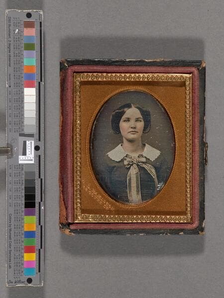 Brooch and earrings are hand-colored gold. Photographer: Marcellus Kertson, New York. Stamped on mat: "Kertson 421 Broadway. Cor. Canal St. N.Y." Date based on years photographer operated at this address. A paper illustration of Abraham Lincoln and his son Tad had been placed in the frame over the image; the ambrotype was found underneath.