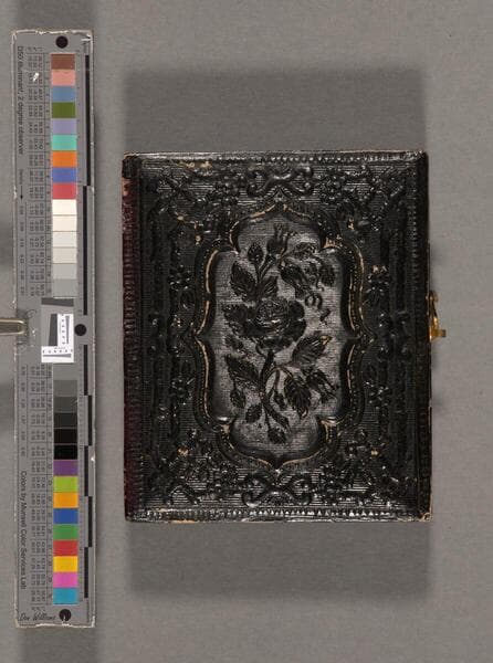 Paper advertisement in case under image for photographer Davis & Co., Boston. Date based on years of major usage of ambrotypes.